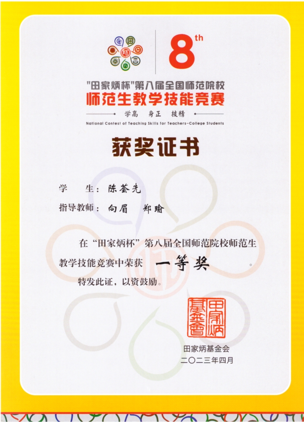 其中,2020级陈荟先取得“田家炳”杯第八届全国师范院校师范生教学技能竞赛思想政治教育组一等奖;2020级张雯棋获得川渝首届师范生教学能力大赛高中思想政治组二等奖;2020级蒋楸芸在川渝首届师范生教学能力大赛初中道德与法治组获得二等奖。